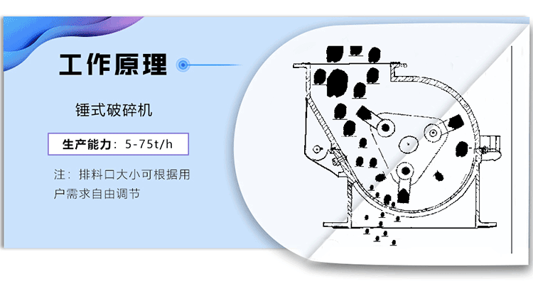 錘式破碎機(jī)電動(dòng)機(jī)帶動(dòng)轉(zhuǎn)子在破碎腔內(nèi)高速旋轉(zhuǎn)。物料自上部給料口給入機(jī)內(nèi),受高速運(yùn)動(dòng)的錘子的打擊、沖擊、剪切、研磨作用而粉碎。在轉(zhuǎn)子下部,設(shè)有篩板、粉碎物料中小于篩孔尺寸的粒級(jí) 通過(guò)篩板排出,大于篩孔尺寸的粗粒級(jí) 阻留在篩板上繼續(xù)受到錘子的打擊和研磨, 然后通過(guò)篩板排出機(jī)外。