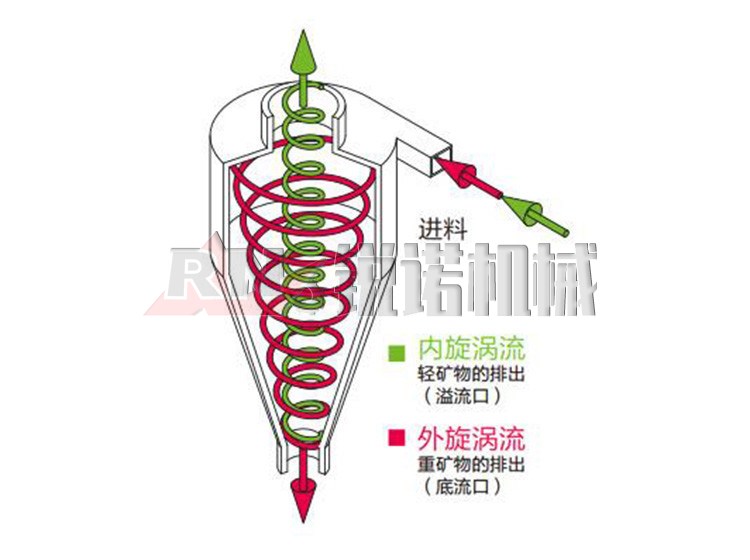 水力旋流器用砂泵(或高差)以一定壓力(一般是0.5~2.5公斤/厘米)和流速(約5~12米/秒)將礦漿沿切線方向旋入圓筒,然后礦漿便以很快的速度沿筒壁旋轉(zhuǎn)而產(chǎn)生離心力。通過(guò)離心力和重力的作用下,將較粗、較重的礦粒拋出。